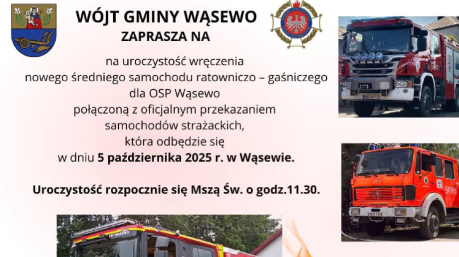 W niedzielę 5 października 2025 r. o godz. 11.30 przy kościele przy ul. Armii Krajowej w Wąsewie odbędzie się msza, po której nastąpi oficjalne przekazanie nowego średniego samochodu ratowniczo‑gaśniczego dla OSP Wąsewo oraz wręczenie pojazdów strażackich trzem innym jednostkom OSP.