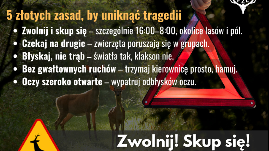 1. Zwolnienie i skupienie: zwłaszcza między 16:00 a 8:00 rano, w okolicach lasów i pól. Noga z gazu! Jazda „na pamięć” to największy błąd.