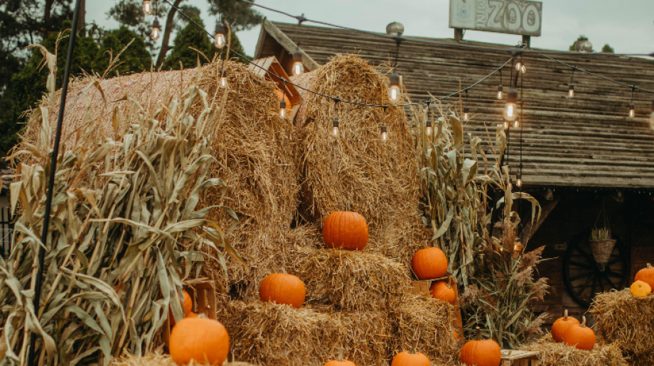 Jesienna sceneria Folwarku to gotowy plener zdjęciowy – snopy siana, dynie, ognisko i światła tworzą tło jak z bajki.