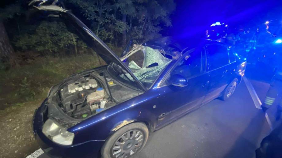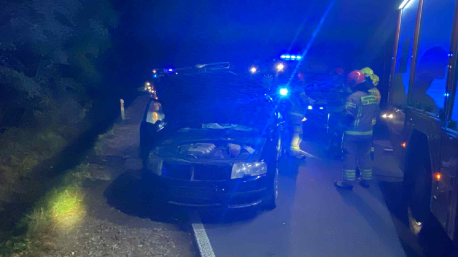 Zwierzę leśne nagle wbiegło na drogę, a samochód osobowy z dużą siłą uderzył w nie na prostym odcinku trasy. Ucierpiały dwie osoby.