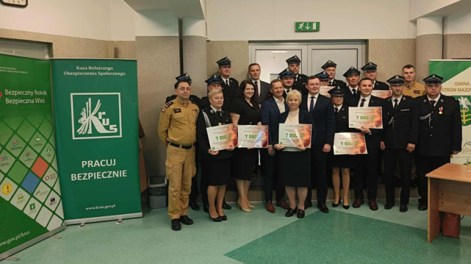 Symboliczny czek przekazali przedstawiciele KRUS – Mateusz Morawski kierownik Punktu Terenowego KRUS w Ostrowi Mazowieckiej oraz Justyna Pętkowska, radna powiatowa i pracownik instytucji. W wydarzeniu wzięli udział prezes OSP Zaręby Kościelne Jarosław Goca oraz wójt gminy Zaręby Kościelne Urszula Wołosiewicz. Uroczystość swoją obecnością uświetnił także st. bryg. Leszek Falbowski, Komendant Powiatowy Państwowej Straży Pożarnej w Ostrowi Mazowieckiej.