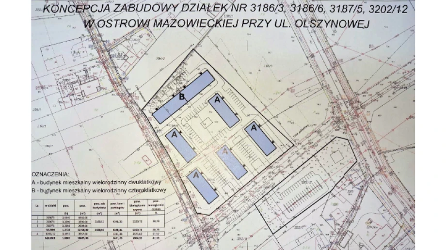 W dokumentach dotyczących tej sprawy znajduje się także koncepcja zabudowy działek przy ul. Olszynowej. Na mapie opisanej jako "Koncepcja zabudowy działek nr 3186/3, 3186/6, 3187/5, 3202/12 w Ostrowi Mazowieckiej przy ul. Olszynowej" pokazano planowane osiedle. Z legendy wynika, że przewidziano sześć budynków mieszkalnych: pięć budynków oznaczono literą "A" jako budynki wielorodzinne dwuklatkowe, jeden budynek oznaczono literą "B" jako budynek wielorodzinny czteroklatkowy. Na rysunku zaznaczono także miejsca postojowe i układ dojazdów.