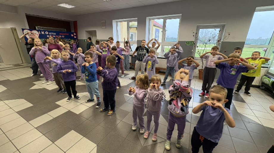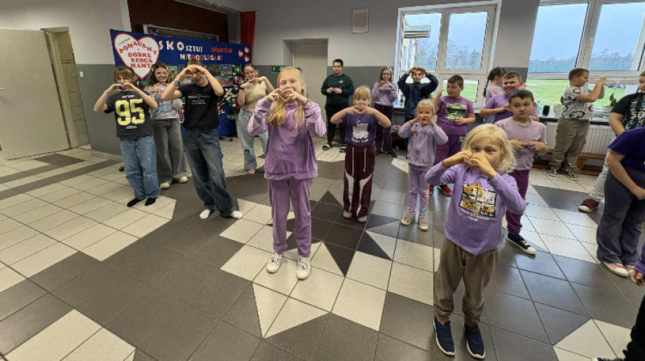 W akcję włączyły się wszystkie klasy, tworząc wspólnie fioletowe serce z balonów — symbol empatii, nadziei i siły, które dodają otuchy tym najbardziej kruchym.