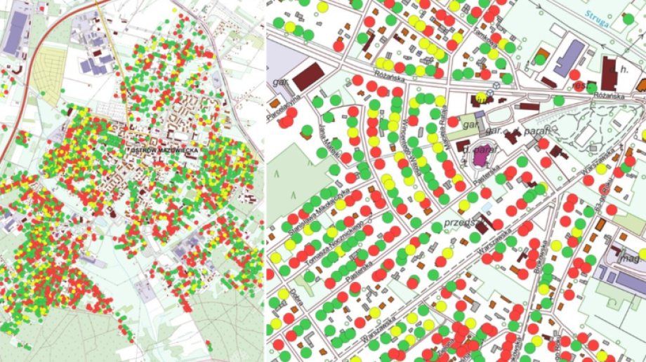 Miasto Ostrów Mazowiecka opublikowało mapę z systemu IMPAQT. Widać na niej dużą część miasta pokrytą gęstą siecią kolorowych kółek. Każde kółko oznacza jeden budynek i jest powiązane z danymi o źródle ciepła z Centralnej Ewidencji Emisyjności Budynków (CEEB). Z komunikatu ratusza wynika, że dom zaznaczony na czerwono jest traktowany jako adres do kontroli.