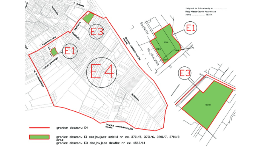 Na mapie dołączonej do projektu uchwały wszystkie te symbole są pokazane razem. E1 nie jest zmieniany tą uchwałą, ale nadal należy do Etapu piątego, dlatego został zaznaczony, żeby pokazać pełny obraz. Zmiana dotyczy tego, jak podzielono dawny obszar E2: osobno wydzielono działkę przy szpitalu (E3), a osobno resztę terenu (E4). Dzięki temu można będzie prowadzić prace planistyczne oddzielnie dla E3 i oddzielnie dla E4.