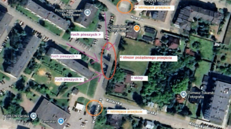 Osobny fragment dotyczy przejścia dla pieszych w rejonie sklepu Pierrot i pizzerii Costa Gargano. Pecura argumentuje, że mieszkańcy chcą przejścia w miejscu, gdzie ruch pieszy jest naturalny, a przy okazji pada temat parkowania samochodów dwoma kołami na chodniku i szukania rozwiązań kompromisowych, które nie zablokują tego układu. Radny dopisuje też, że dołącza mapę pokazującą ruch pieszych.
