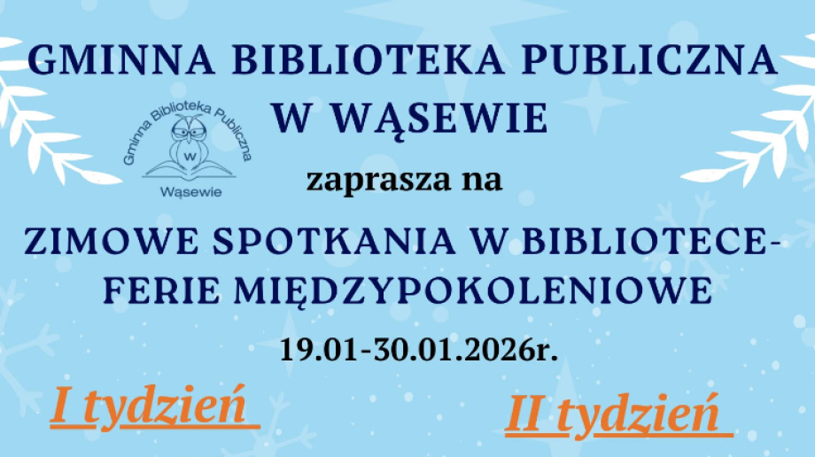 Gminna Biblioteka Publiczna w Wąsewie przygotowała ciekawą i różnorodną propozycję na tegoroczne ferie zimowe. Od 19 do 30 stycznia 2026 roku biblioteka zaprasza dzieci, młodzież oraz seniorów na Zimowe Spotkania w Bibliotece – Ferie Międzypokoleniowe, których ideą jest wspólne spędzanie czasu, integracja pokoleń oraz twórcza zabawa.