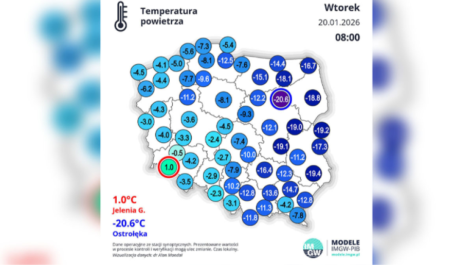 Dane Instytutu Meteorologii i Gospodarki Wodnej nie pozostawiają wątpliwości. To właśnie Ostrołęka była dziś najzimniejszym miejscem w Polsce. O godzinie 8.00 stacja pomiarowa w tym mieście wskazała -20,6 stopnia.