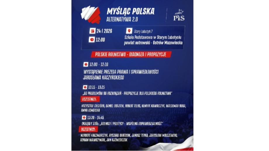 Wydarzenie odbędzie się w sobotę, 24 stycznia w Szkole Podstawowej w Starym Lubotyniu. Spotkanie organizowane jest w ramach ogólnopolskiego cyklu Myśląc Polska. Alternatywa 2.0, przygotowywanego przez Prawo i Sprawiedliwość.