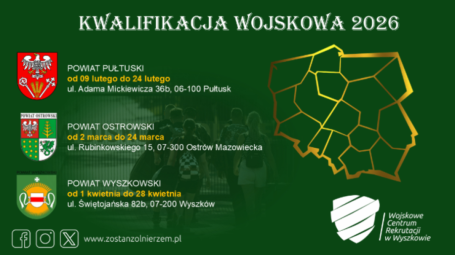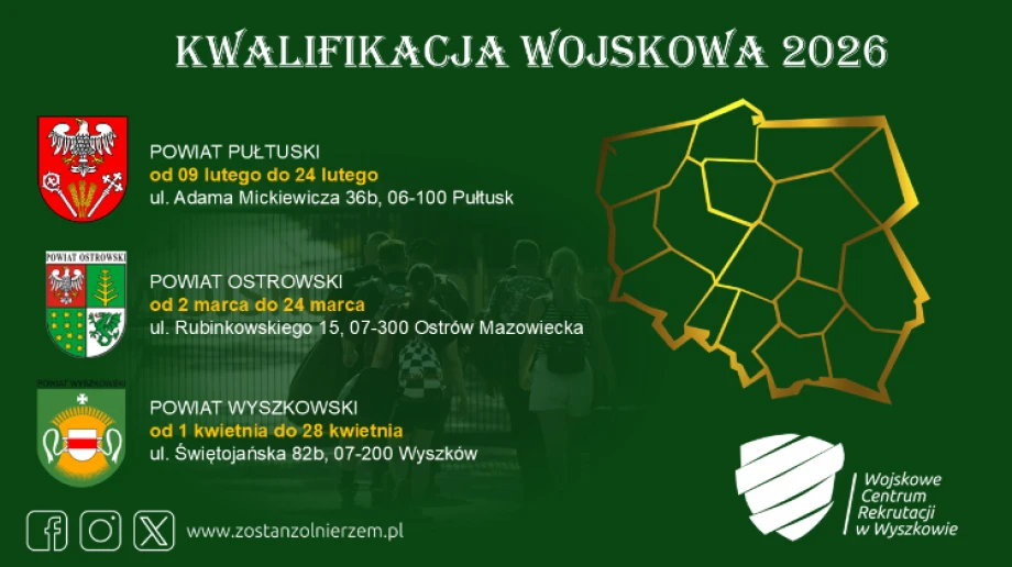 - Kwalifikacja wojskowa 2026 obejmie w tym roku ok. 235 tys. osób, a w województwie mazowieckim będzie ponad 36 tyś. (ok. 36412 w tym ok. 2085 kobiet). Na terenie administrowanym przez Wojskowe Centrum Rekrutacji w Wyszkowie działają 3 Powiatowe Komisje Lekarskie: w Pułtusku, Ostrowi Mazowieckiej i Wyszkowie.