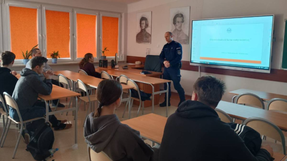 Podczas rozmowy z młodzieżą, policjant poruszył temat zasad bezpiecznego korzystania z internetu, zwracając szczególną uwagę na kwestie związane z udostępnianiem w sieci wizerunku innych osób bez ich zgody. Uczniowie dowiedzieli się także o odpowiedzialności karnej osób nieletnich oraz przykładach demoralizacji i czynów karalnych, które mogą być popełniane przez młodzież w internecie.