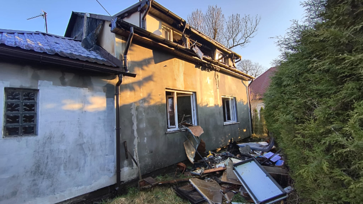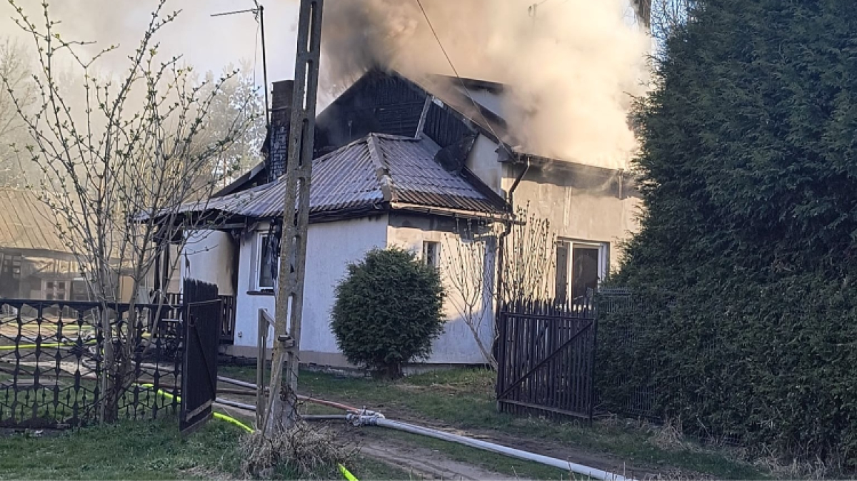 Pożar wybuchł w piątek 10 kwietnia 2026 ok. godz. 16.00. Ogień zniszczył znaczną część drewnianego domu.