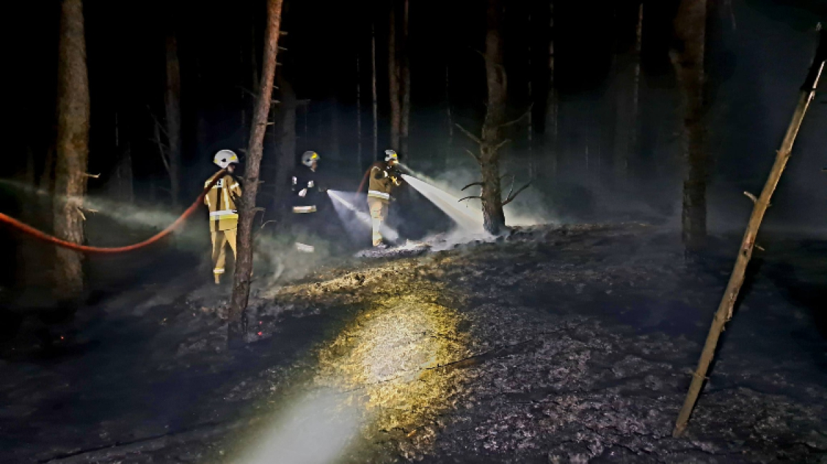 Strażacy po dotarciu na miejsce zastali rozwijający się pożar. Ogień objął już znaczną powierzchnię lasu. Działania gaśnicze były trudne, ponieważ gruba warstwa poszycia utrudniała skuteczne dotarcie do zarzewi ognia. Ratownicy musieli dokładnie przelewać teren, aby zapobiec ponownemu rozprzestrzenianiu się pożaru.
